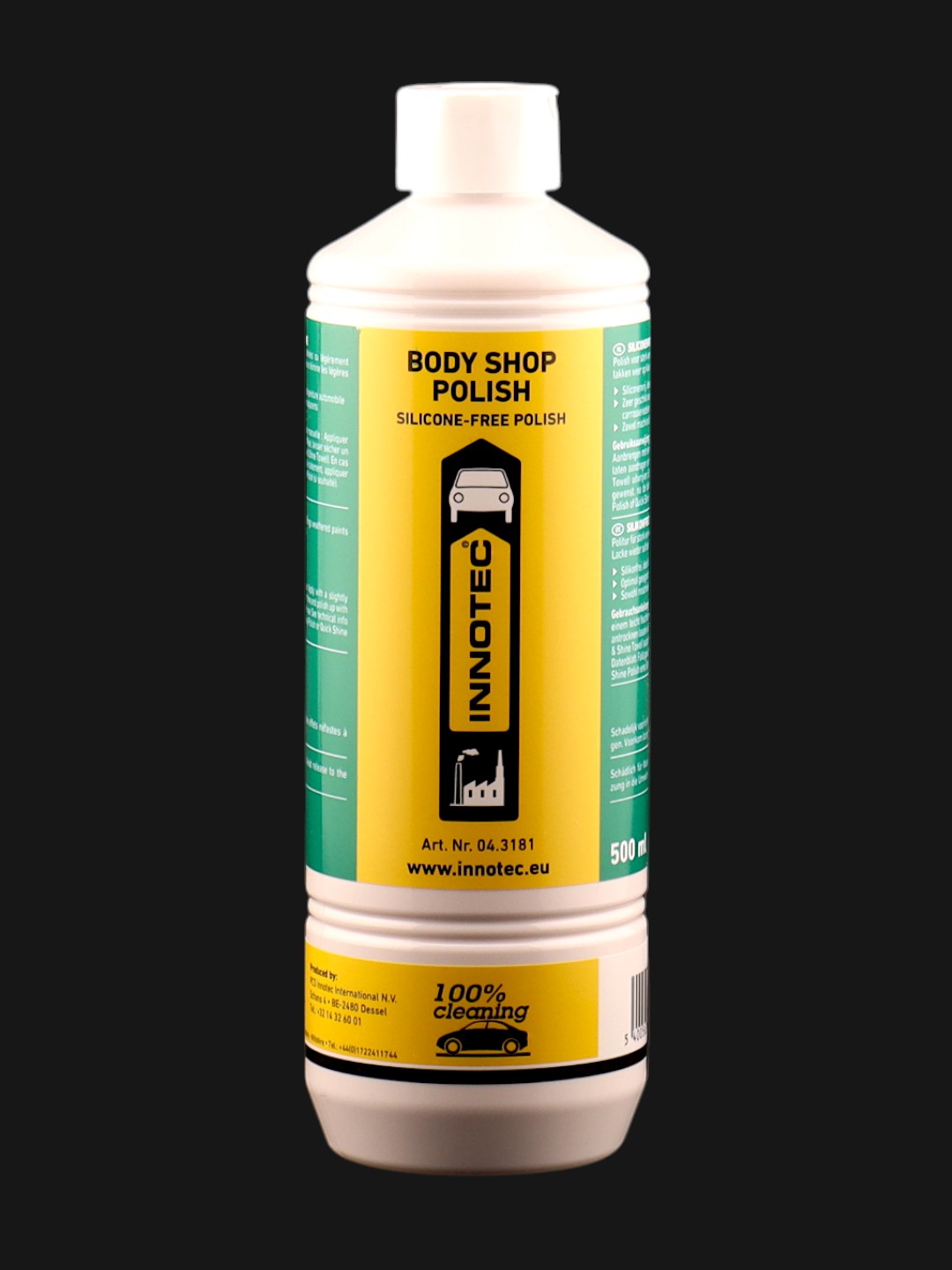 Body Shop Polish ist ein einzigartiges silikonfreies Poliermittel für stark verwitterte oder leicht beschädigte Lacke. Es bringt verwitterte Lacke wieder auf den Original-Farbton und entfernt leichte Kratzer. Das Produkt besteht zu 100% aus reinigenden Substanzen und lässt daher keinen Schutzfilm zurück. Somit eignet sich Body Shop Polish bestens zur Reinigung und Ausbesserung stark verwitterter und leicht schadhafter Lacke. Body Shop Polish ist vollkommen silikonfrei und daher das ideale Produkt für Karosseriewerkstätten und Lackierbetriebe, wo es auch beim Glanzpolieren der umliegenden Karosserieteile nach Lackierarbeiten überzeugt. Body Shop Polish lässt sich mühelos von Hand auftragen und abwischen (vorzugsweise mit einem Innotec Multi Wipe oder Clean & Shine Towel), aber es kann natürlich auch mit einer Poliermaschine verarbeitet werden (mit einem Innotec Spot Pad Wool oder Spot Pad Foam und dem Innotec Spot Pad Support). Die Korngröße lässt sich ganz einfach anpassen, indem man die zu behandelnde Fläche mit Wasser besprüht. Dabei gilt: je mehr Wasser, desto feiner die Korngröße. Flächen, die mit Body Shop Polish behandelt wurden, sollten anschließend mit Easy Polish oder Quick Shine Polish geschützt werden, um ein perfektes Ergebnis zu erzielen. In der handlichen Halbliterflasche mit Dosierdeckel ist Body Shop Polish äußerst benutzerfreundlich und anwendungspraktisch.